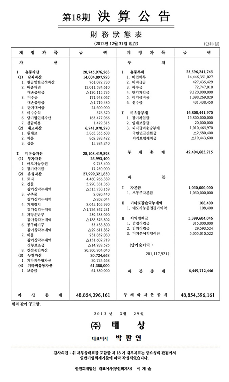 2013³â ¢ßÅ»ó Á¦18±â À繫»óÅÂÇ¥ ÀüÀÚ°ø°í