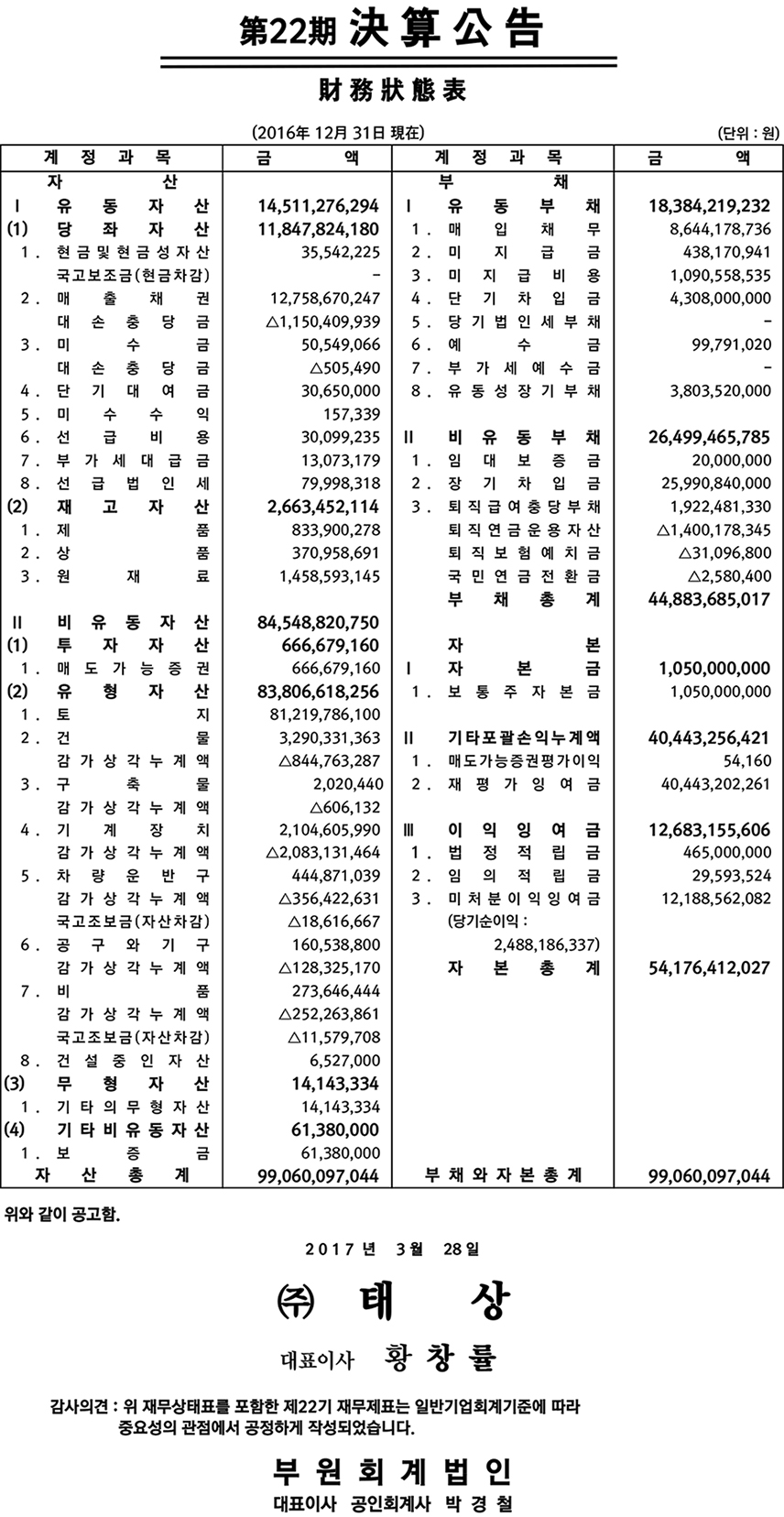 2017³â ¢ßÅ»ó Á¦22±â À繫»óÅÂÇ¥ ÀüÀÚ°ø°í
